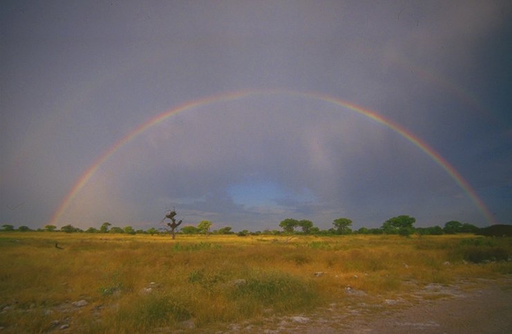 Regenbogen im Etosha-Nationalpark in Namibia (der äußere der beiden Bögen ist knapp zu erkennen)