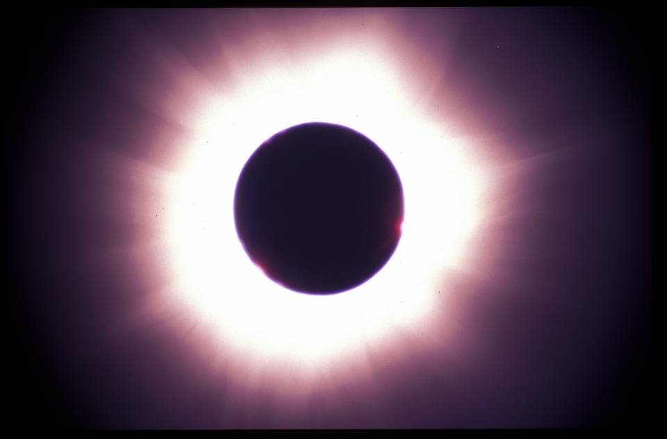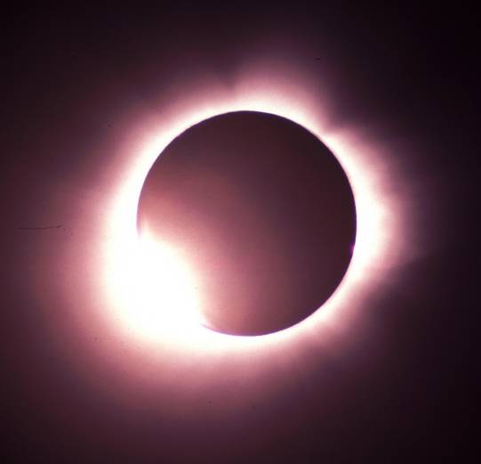 Korona kurz vor dem 3. Kontakt (die Protuberanzen unten links überstrahlen den Mondrand)